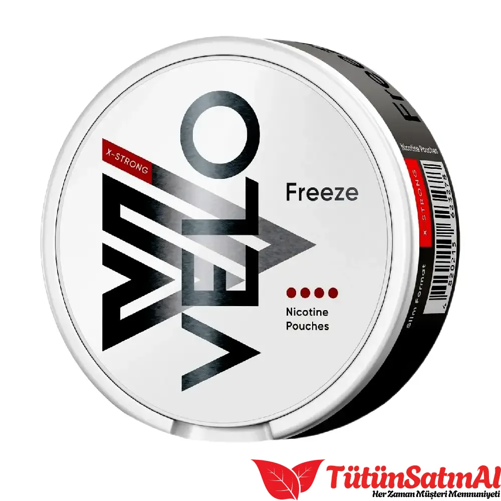 Velo X-Strong Freeze (VELO Freeze X-Strong), VELO serisinin en ikonik ve en güçlü mint varyantı — şu anda resmi adıyla VELO Freezing Peppermint (X-Strong / Max seviyesi) olarak geçiyor. Önceki sordukların gibi (Zesty Elderflower, Mango Flame, Freeze genel), bu da tobaksız, all-white nikotin pouch; dudak altına yerleştirilen, çiğnenmeyen bir ürün.